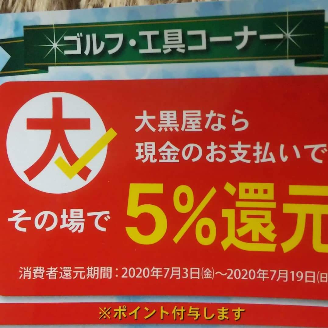 ゴルフ・工具コーナーでは、現金のお買い上げで、お買い上げ金額の5%を還元させて頂きます。(ポイントで付与)